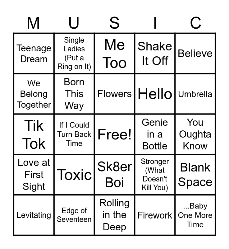 This bingo card has a free space and 46 words: Like a Prayer, ...Baby One More Time, I Wanna Dance with Somebody, Rolling in the Deep, Toxic, Vogue, Single Ladies (Put a Ring on It), Halo, We Belong Together, Bad Romance, Born This Way, Shake It Off, Blank Space, Stronger (What Doesn't Kill You), Since U Been Gone, Wrecking Ball, Flowers, Genie in a Bottle, Beautiful, Believe, If I Could Turn Back Time, Firework, Teenage Dream, Hello, Un-break My Heart, Umbrella, Levitating, Complicated, Sk8er Boi, Love at First Sight, Can’t Get You Out of My Head, I Will Always Love You, Waiting for Tonight, No Tears Left to Cry, Thank U, Next, Edge of Seventeen, You Oughta Know, I Will Survive, Total Eclipse of the Heart, I’m Every Woman, Tell It to My Heart, Me Too, Tik Tok, A Thousand Miles, Unwritten and Call Me Maybe.