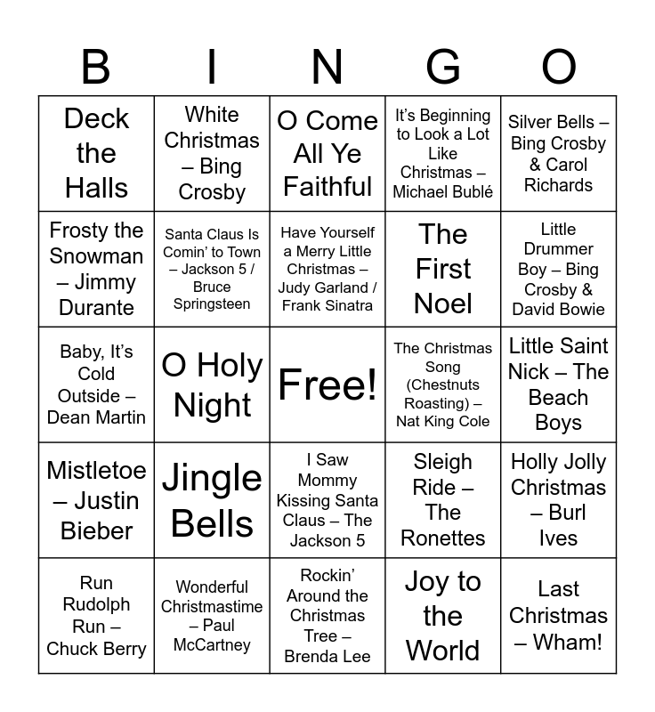 This bingo card has a free space and 50 words: All I Want for Christmas Is You – Mariah Carey, Last Christmas – Wham!, Jingle Bell Rock – Bobby Helms, Rockin’ Around the Christmas Tree – Brenda Lee, Jingle Bells, Silent Night, White Christmas – Bing Crosby, Let It Snow! Let It Snow! Let It Snow! – Dean Martin, Frosty the Snowman – Jimmy Durante, Rudolph the Red-Nosed Reindeer – Gene Autry, Santa Claus Is Comin’ to Town – Jackson 5 / Bruce Springsteen, It’s Beginning to Look a Lot Like Christmas – Michael Bublé, Holly Jolly Christmas – Burl Ives, Sleigh Ride – The Ronettes, Feliz Navidad – José Feliciano, Winter Wonderland, Have Yourself a Merry Little Christmas – Judy Garland / Frank Sinatra, The Christmas Song (Chestnuts Roasting) – Nat King Cole, Blue Christmas – Elvis Presley, Silver Bells – Bing Crosby & Carol Richards, O Holy Night, Joy to the World, Deck the Halls, The First Noel, Hark! The Herald Angels Sing, Carol of the Bells – Trans-Siberian Orchestra, Little Drummer Boy – Bing Crosby & David Bowie, We Wish You a Merry Christmas, O Come All Ye Faithful, I Saw Mommy Kissing Santa Claus – The Jackson 5, Do You Hear What I Hear? – Whitney Houston / Bing Crosby, Mary, Did You Know? – Pentatonix, Christmas (Baby Please Come Home) – Darlene Love, Happy Xmas (War Is Over) – John Lennon, Wonderful Christmastime – Paul McCartney, Mele Kalikimaka – Bing Crosby, I’ll Be Home for Christmas – Bing Crosby, Here Comes Santa Claus – Gene Autry, Up on the Housetop, Little Saint Nick – The Beach Boys, Grandma Got Run Over by a Reindeer – Elmo & Patsy, Silver and Gold – Burl Ives, Christmas Time Is Here – Vince Guaraldi, It's the Most Wonderful Time of the Year – Andy Williams, Run Rudolph Run – Chuck Berry, Baby, It’s Cold Outside – Dean Martin, Christmas Wrapping – The Waitresses, Underneath the Tree – Kelly Clarkson, Mistletoe – Justin Bieber and Believe – Josh Groban.