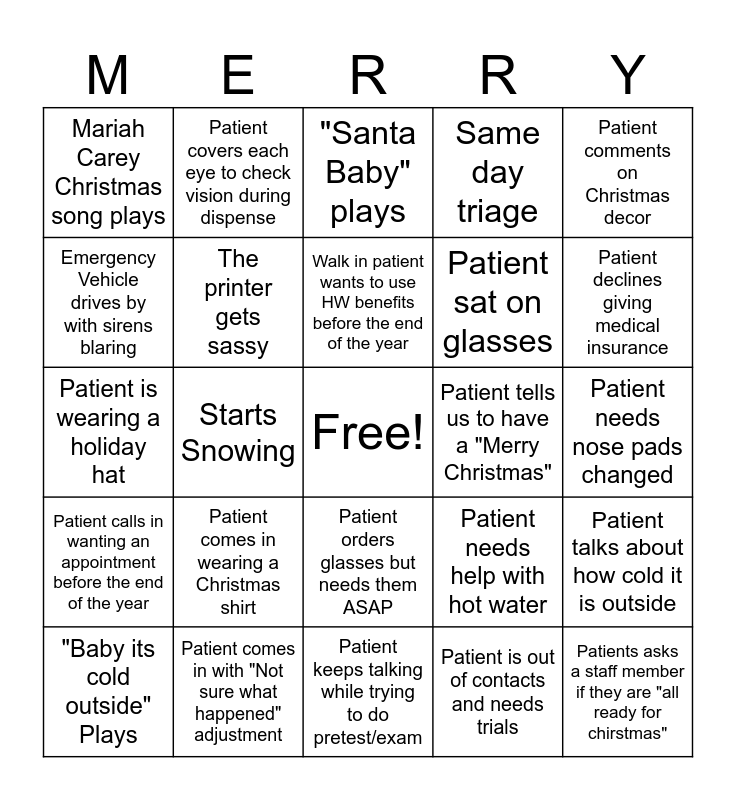 This bingo card has a free space and 24 words: Patient comes in wearing a Christmas shirt, Patient comes in with "Not sure what happened" adjustment, Walk in patient wants to use HW benefits before the end of the year, "Baby its cold outside" Plays, Patient comments on Christmas decor, Mariah Carey Christmas song plays, Emergency Vehicle drives by with sirens blaring, Patient covers each eye to check vision during dispense, Patient tells us to have a "Merry Christmas", Patient orders glasses but needs them ASAP, Patient sat on glasses, Patient is wearing a holiday hat, Patient needs help with hot water, Patient talks about how cold it is outside, The printer gets sassy, Patient is out of contacts and needs trials, Patient needs nose pads changed, "Santa Baby" plays, Patient declines giving medical insurance, Starts Snowing, Patients asks a staff member if they are "all ready for chirstmas", Patient calls in wanting an appointment before the end of the year, Same day triage and Patient keeps talking while trying to do pretest/exam.