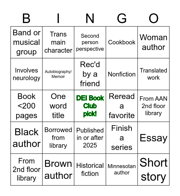 This bingo card has a free space and 26 words: Published in or after 2025, Minnesotan author, Rec'd by a friend, Brown author, Woman author, Band or musical group, Involves neurology, Trans main character, From AAN 2nd floor library, Finish a series, Nonfiction, Book <200 pages, Essay, From 2nd floor library, One word title, Indigenous author, Cookbook, Black author, Second person perspective, Short story, Translated work, Historical fiction, Reread a favorite, Borrowed from library, Autobiography/ Memoir and Number(s) in the title.