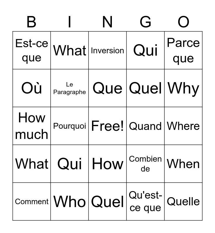 This bingo card has a free space and 24 words: Qui, Who, Que, Comment, Parce que, Est-ce que, Où, What, Quand, How, Quel, How much, Combien de, When, Le Paragraphe, Qu'est-ce que, Where, Inversion, Why, Pourquoi, Quelle, What, Qui and Quel.