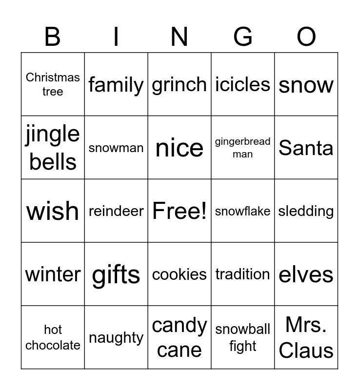 This bingo card has a free space and 24 words: gifts, naughty, nice, hot chocolate, snow, Christmas tree, jingle bells, family, snowflake, cookies, gingerbread man, wish, tradition, elves, snowman, snowball fight, sledding, grinch, Santa, reindeer, Mrs. Claus, winter, icicles and candy cane.