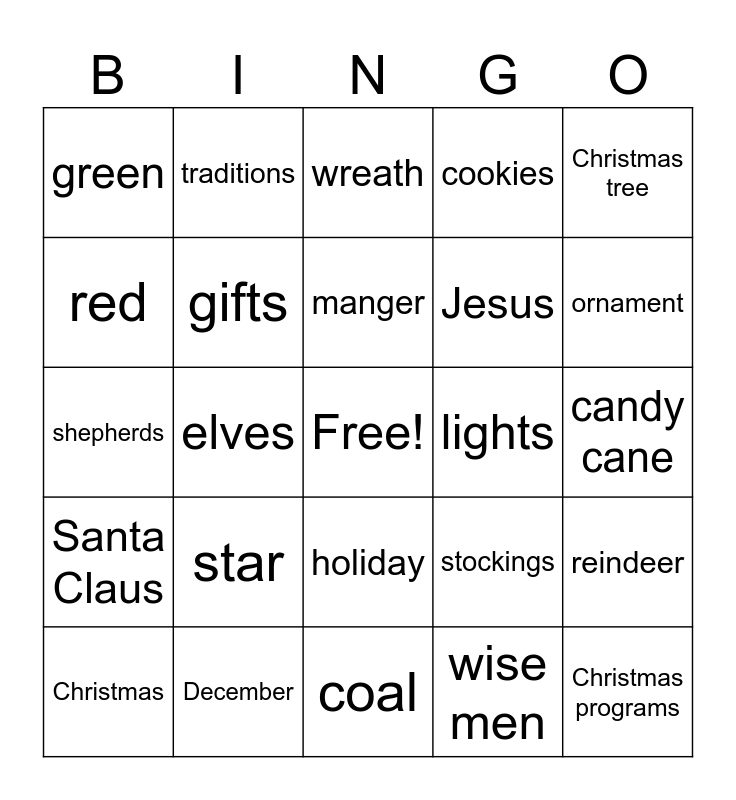 This bingo card has a free space and 24 words: star, December, manger, Christmas, Christmas tree, green, red, traditions, lights, holiday, Jesus, shepherds, stockings, reindeer, gifts, wise men, candy cane, wreath, ornament, elves, Christmas programs, Santa Claus, cookies and coal.