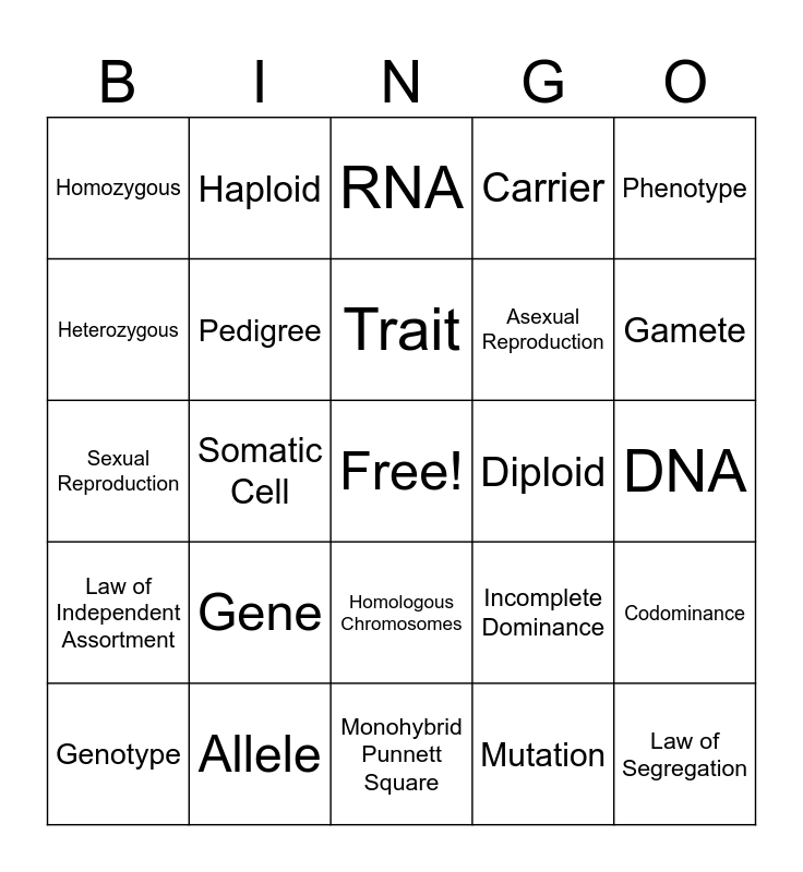 This bingo card has a free space and 24 words: Gene, Allele, Trait, Genotype, Phenotype, Homozygous, Heterozygous, Haploid, Diploid, Homologous Chromosomes, Asexual Reproduction, Sexual Reproduction, Incomplete Dominance, Codominance, Pedigree, Mutation, DNA, RNA, Gamete, Somatic Cell, Law of Segregation, Law of Independent Assortment, Carrier and Monohybrid Punnett Square.