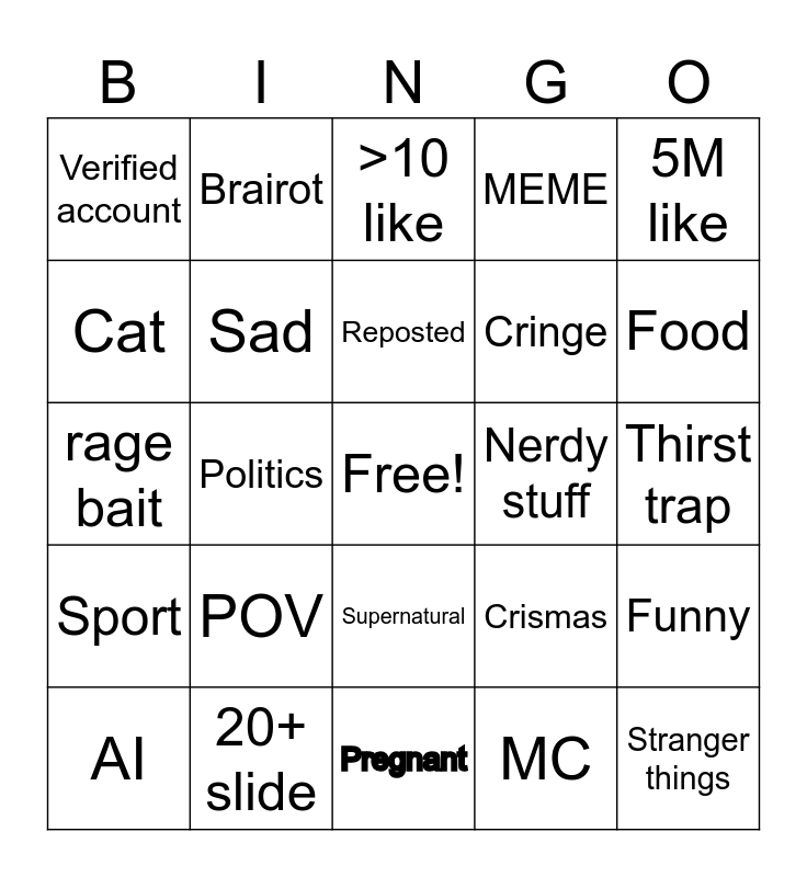 This bingo card has a free space and 24 words: POV, 20+ slide, Reposted, AI, 5M like, Verified account, Cat, Brairot, Nerdy stuff, Supernatural, Cringe, rage bait, Crismas, Funny, Sad, MC, Thirst trap, >10 like, Food, Politics, Stranger things, Sport, MEME and Pregnant.