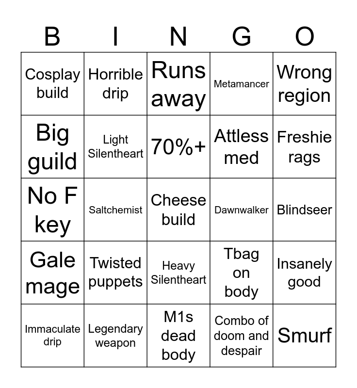 This bingo card has a free space and 24 words: Twisted puppets, Legendary weapon, 70%+, Immaculate drip, Wrong region, Cosplay build, Big guild, Horrible drip, Dawnwalker, Heavy Silentheart, Attless med, No F key, Tbag on body, Insanely good, Light Silentheart, Combo of doom and despair, Blindseer, Runs away, Freshie rags, Saltchemist, Smurf, Gale mage, Metamancer and M1s dead body.