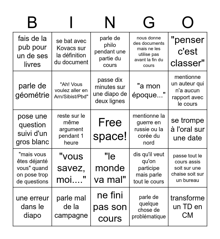 This bingo card has a free space and 24 words: "vous savez, moi....", parle mal de la campagne, passe dix minutes sur une diapo de deux lignes, une erreur dans le diapo, "penser c'est classer", fais de la pub pour un de ses livres, parle de géométrie, se bat avec Kovacs sur la définition du document, mentionne la guerre en russie ou la corée du nord, "le monde va mal", "a mon époque...", pose une question suivi d'un gros blanc, dis qu'il veut qu'on participe mais parle tout le cours, passe tout le cours assis soit sur une chaise soit sur un bureau, "Ah! Vous voulez aller en Arn/Sibist/Pbd", parle de quelque chose de problématique, se trompe à l'oral sur une date, parle de philo pendant une partie du cours, mentionne un auteur qui n'a aucun rapport avec le cours, reste sur le même argument pendant 1 heure, transforme un TD en CM, "mais vous êtes déjanté vous" quand on pose trop de questions, nous donne des documents mais ne les utilise pas avant la fin du cours and ne fini pas son cours.