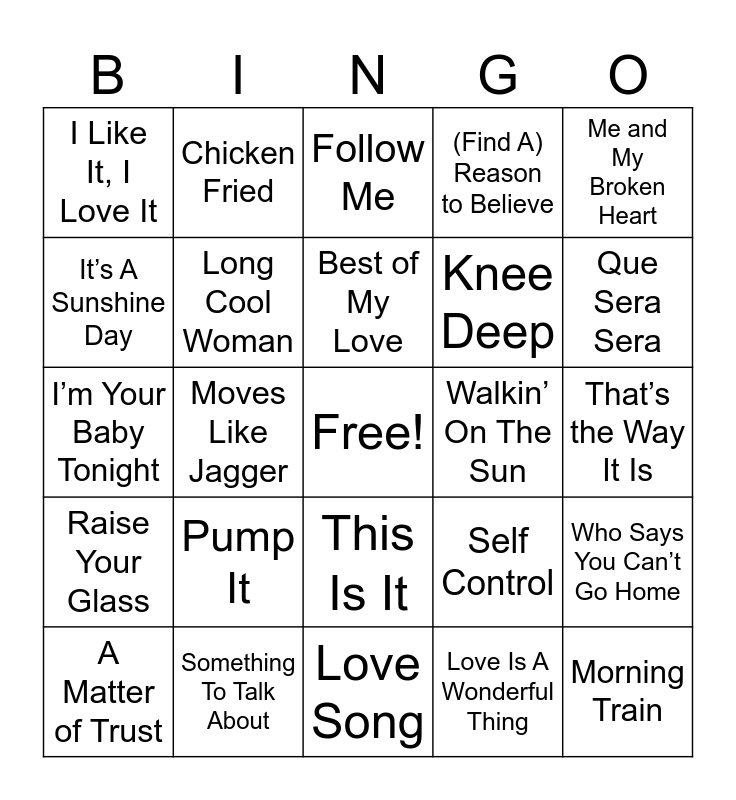 This bingo card has a free space and 56 words: Jolene, A Matter of Trust, Diamond Girl, I Like It, I Love It, Love Song, Working for the Weekend, Long Cool Woman, Rockin’ Robin, Knee Deep, Jeopardy, (Find A) Reason to Believe, Johnny B. Goode, It’s 5:00 Somewhere, It’s My Life, Druck (& I Don’t Wanna Go Home), Hollywood Nights, Me and My Broken Heart, Moves Like Jagger, Knock Three Times, Morning Train, Walkin’ On The Sun, Hound Dog, Self Control, Follow Me, Don’t Do Me Like That, Best of My Love, Before He Cheats, The Shoop Shoop Song, Que Sera Sera, Baby Hold On, The Best, SOS, Eternal Flame, You Never Can Tell, That’s the Way It Is, It’s A Sunshine Day, I’m Your Baby Tonight, This Will Be (An Everlasting Love), Raise Your Glass, Chicken Fried, This Is It, If I Could Turn Back Time, One Bad Apple, Leader of the Pack, You’re No Good, Pump It, Something To Talk About, Livin’ La Vida Loca, Party In The USA, California Gurls, Love Is A Wonderful Thing, Love Shack, Everlasting Love, Kiss on My List, Who Says You Can’t Go Home and Islands in the Stream.