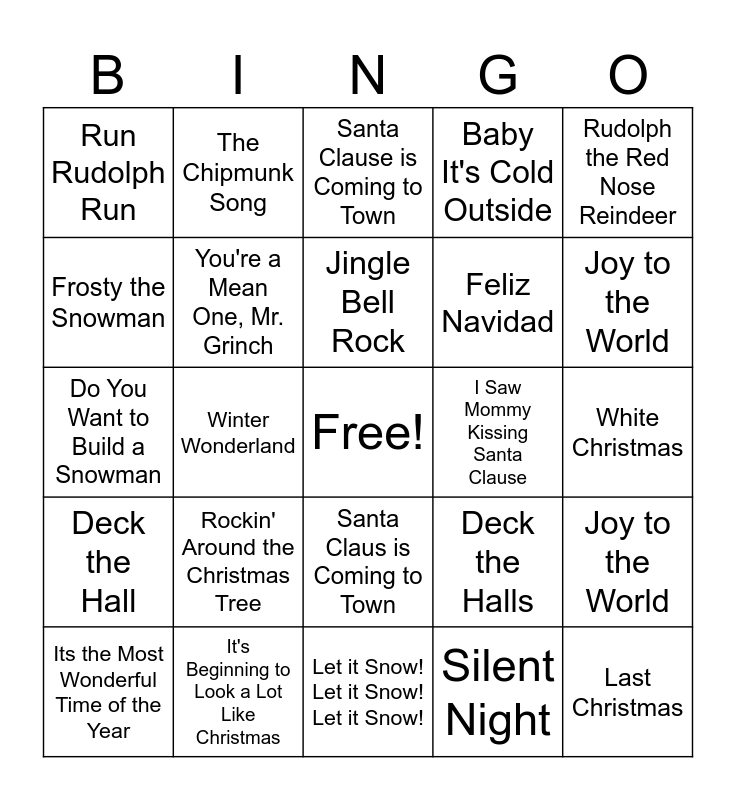 This bingo card has a free space and 25 words: Rockin' Around the Christmas Tree, Let it Snow! Let it Snow! Let it Snow!, Jingle Bell Rock, Its the Most Wonderful Time of the Year, Rudolph the Red Nose Reindeer, Run Rudolph Run, Frosty the Snowman, The Chipmunk Song, I Saw Mommy Kissing Santa Clause, Santa Claus is Coming to Town, Feliz Navidad, Do You Want to Build a Snowman, Deck the Halls, Joy to the World, You're a Mean One, Mr. Grinch, Home for the Holidays, White Christmas, Santa Clause is Coming to Town, Joy to the World, Winter Wonderland, Last Christmas, It's Beginning to Look a Lot Like Christmas, Deck the Hall, Baby It's Cold Outside and Silent Night.
