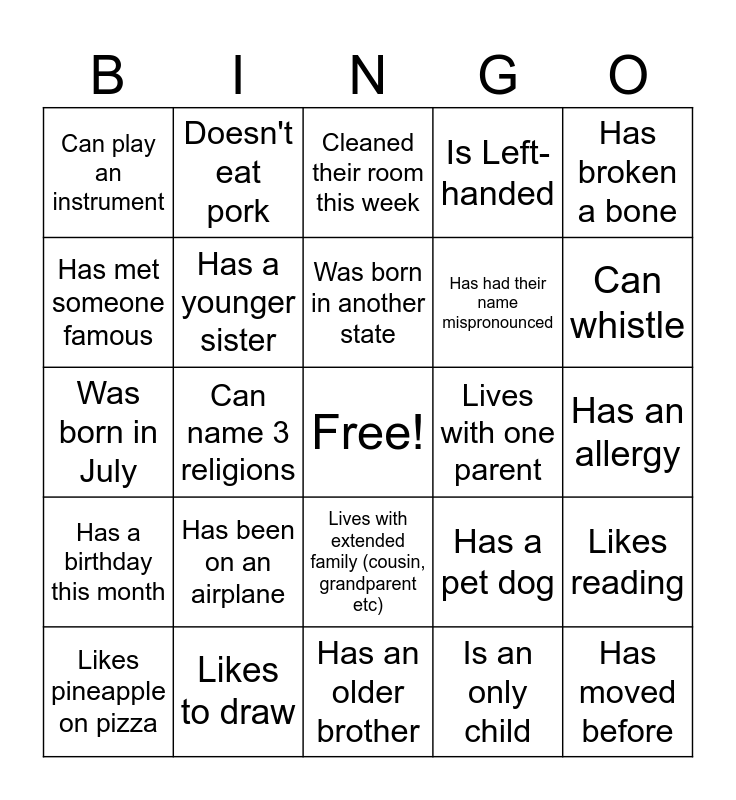 This bingo card has a free space and 24 words: Has been on an airplane, Likes to draw, Was born in another state, Likes pineapple on pizza, Has broken a bone, Can play an instrument, Has met someone famous, Doesn't eat pork, Lives with one parent, Lives with extended family (cousin, grandparent etc), Has had their name mispronounced, Was born in July, Has a pet dog, Likes reading, Has a younger sister, Is an only child, Has an allergy, Cleaned their room this week, Can whistle, Can name 3 religions, Has moved before, Has a birthday this month, Is Left-handed and Has an older brother.