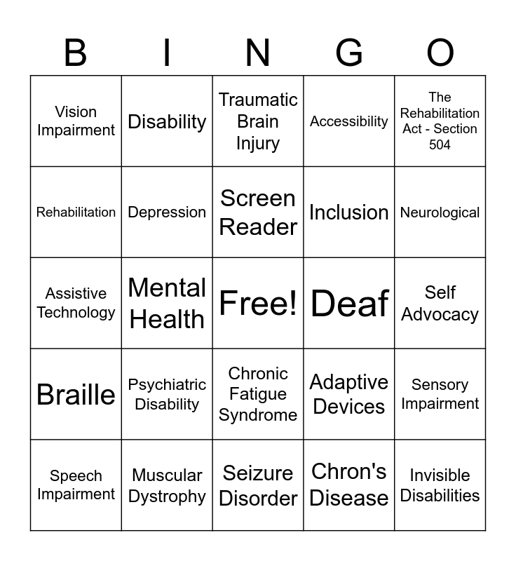 This bingo card has a free space and 24 words: Psychiatric Disability, Muscular Dystrophy, Screen Reader, Speech Impairment, The Rehabilitation Act - Section 504, Vision Impairment, Rehabilitation, Disability, Deaf, Chronic Fatigue Syndrome, Inclusion, Assistive Technology, Adaptive Devices, Sensory Impairment, Depression, Chron's Disease, Self Advocacy, Traumatic Brain Injury, Neurological, Mental Health, Invisible Disabilities, Braille, Accessibility and Seizure Disorder.