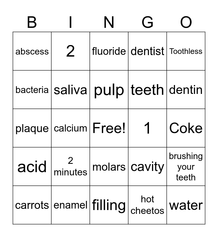 This bingo card has a free space and 24 words: 2 minutes, enamel, pulp, carrots, Toothless, abscess, bacteria, 2, 1, molars, teeth, plaque, cavity, brushing your teeth, saliva, hot cheetos, Coke, fluoride, dentin, calcium, water, acid, dentist and filling.