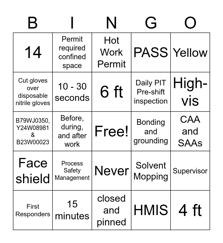 This bingo card has a free space and 24 words: Process Safety Management, 15 minutes, 6 ft, First Responders, Yellow, 14, Cut gloves over disposable nitrile gloves, Permit required confined space, Bonding and grounding, Never, Daily PIT Pre-shift inspection, B79WJ0350, Y24W08981 & B23W00023, Solvent Mopping, Supervisor, 10 - 30 seconds, HMIS, CAA and SAAs, Hot Work Permit, High-vis, Before, during, and after work, 4 ft, Face shield, PASS and closed and pinned.