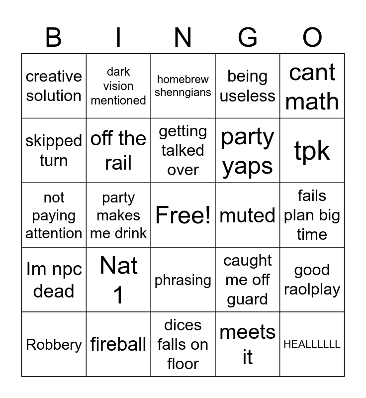 This bingo card has a free space and 24 words: Nat 1, fireball, getting talked over, Robbery, cant math, creative solution, skipped turn, dark vision mentioned, muted, phrasing, party yaps, not paying attention, caught me off guard, good raolplay, off the rail, meets it, fails plan big time, homebrew shenngians, tpk, party makes me drink, HEALLLLLL, Im npc dead, being useless and dices falls on floor.