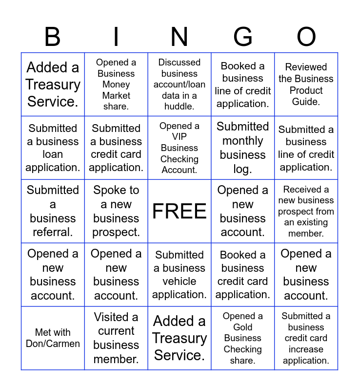 This bingo card has a free space and 24 words: Opened a new business account., Visited a current business member., Opened a VIP Business Checking Account., Met with Don/Carmen, Reviewed the Business Product Guide., Added a Treasury Service., Submitted a business loan application., Opened a Business Money Market share., Opened a new business account., Submitted a business vehicle application., Submitted monthly business log., Submitted a business referral., Booked a business credit card application., Opened a new business account., Submitted a business credit card application., Opened a Gold Business Checking share., Received a new business prospect from an existing member., Discussed business account/loan data in a huddle., Submitted a business line of credit application., Spoke to a new business prospect., Submitted a business credit card increase application., Opened a new business account., Booked a business line of credit application. and Added a Treasury Service..