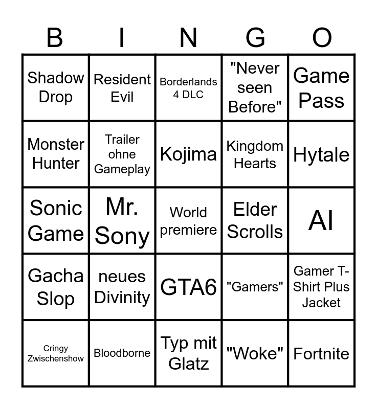 This bingo card has a free space and 24 words: neues Divinity, Bloodborne, Kojima, Cringy Zwischenshow, Game Pass, Shadow Drop, Monster Hunter, Resident Evil, Elder Scrolls, GTA6, Kingdom Hearts, Sonic Game, "Gamers", Gamer T-Shirt Plus Jacket, Trailer ohne Gameplay, "Woke", AI, Borderlands 4 DLC, Hytale, Mr. Sony, Fortnite, Gacha Slop, "Never seen Before" and Typ mit Glatz.