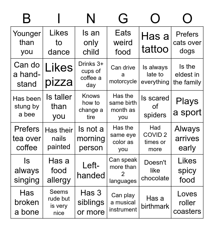 This bingo card has 36 words: Can speak more than 2 languages, Left- handed, Can play a musical instrument, Can do a hand-stand, Prefers tea over coffee, Has the same birth month as you, Likes pizza, Has 3 siblings or more, Has a tattoo, Doesn't like chocolate, Is the eldest in the family, Eats weird food, Likes spicy food, Is taller than you, Can drive a motorcycle, Younger than you, Is always singing, Is scared of spiders, Has been stung by a bee, Is an only child, Knows how to change a tire, Has their nails painted, Has the same eye color as you, Is not a morning person, Had COVID 2 times or more, Likes to dance, Is always late to everything, Seems rude but is very nice, Drinks 3+ cups of coffee a day, Prefers cats over dogs, Loves roller coasters, Has broken a bone, Always arrives early, Plays a sport, Has a food allergy and Has a birthmark.