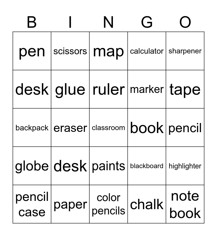 This bingo card has a free space and 24 words: desk, paper, ruler, pencil case, sharpener, pen, desk, scissors, book, paints, marker, backpack, blackboard, highlighter, glue, chalk, pencil, map, tape, eraser, note book, globe, calculator and color pencils.