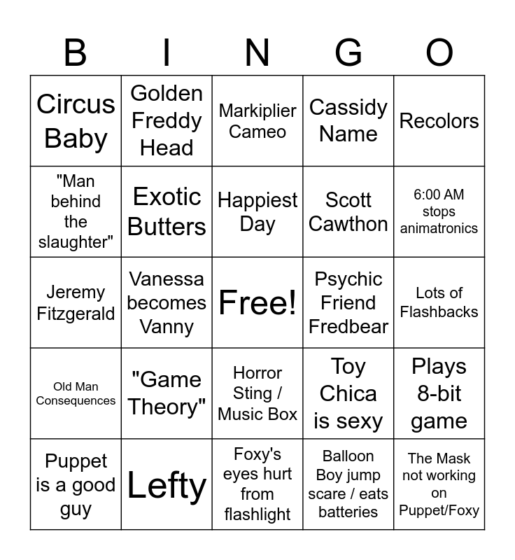 This bingo card has a free space and 29 words: Puppet is a good guy, Springtrap Marvel End Credits Scene, Vanessa becomes Vanny, "I always come back", Circus Baby, Markiplier Cameo, Exotic Butters, "Game Theory", Psychic Friend Fredbear, Lefty, Lots of Flashbacks, The Mask not working on Puppet/Foxy, Foxy's eyes hurt from flashlight, Balloon Boy jump scare / eats batteries, 6:00 AM stops animatronics, Mr. Hippo, Horror Sting / Music Box, Old Man Consequences, Recolors, Jeremy Fitzgerald, Toy Chica is sexy, Book Lore, Scott Cawthon, "Man behind the slaughter", Cassidy Name, Golden Freddy Head, Plays 8-bit game, Happiest Day and The Scooper.