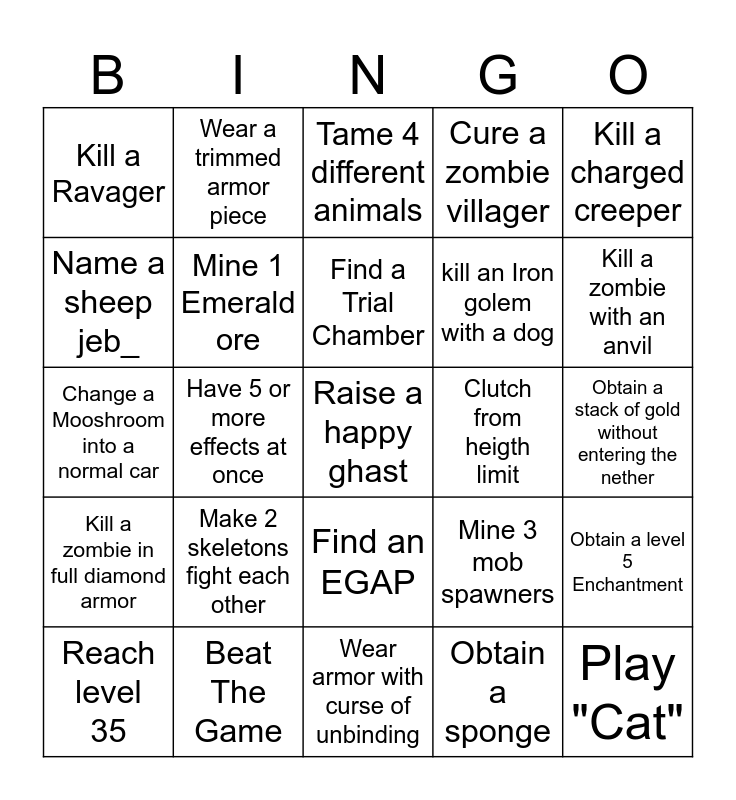 This bingo card has 30 words: Beat The Game, Get a Totem of Undying, Have 5 or more effects at once, Collect 5 echo shards, Kill a Ravager, Tame 4 different animals, Mine 1 Emerald ore, Find an EGAP, Clutch from heigth limit, Wear armor with curse of unbinding, Obtain a stack of gold without entering the nether, Raise a happy ghast, Obtain a sponge, Play "Cat", Kill a zombie with an anvil, Have a tool with 3 enchantments, Mine 3 mob spawners, Kill a zombie in full diamond armor, Make 2 skeletons fight each other, Kill a charged creeper, Change a Mooshroom into a normal car, Find 2 hidden treasures, Wear a trimmed armor piece, kill an Iron golem with a dog, Name a sheep jeb_, Cure a zombie villager, Obtain a level 5 Enchantment, Reach level 35, Find a Trial Chamber and Obtain 3 Gap's in a mineshaft.