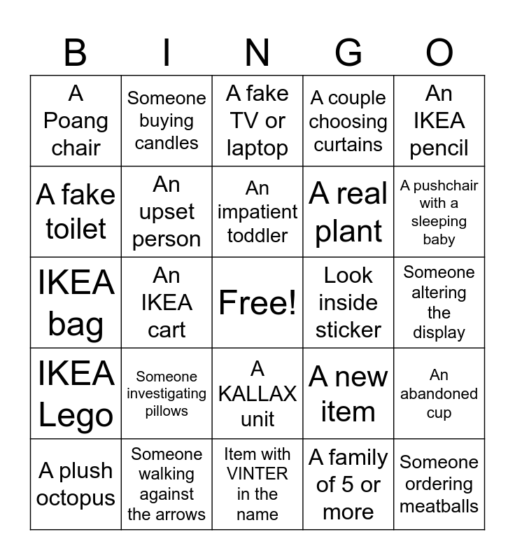 This bingo card has a free space and 24 words: Someone investigating pillows, Someone walking against the arrows, An impatient toddler, A plush octopus, An IKEA pencil, A Poang chair, A fake toilet, Someone buying candles, Look inside sticker, A KALLAX unit, A real plant, IKEA bag, A new item, An abandoned cup, An upset person, A family of 5 or more, Someone altering the display, A fake TV or laptop, A pushchair with a sleeping baby, An IKEA cart, Someone ordering meatballs, IKEA Lego, A couple choosing curtains and Item with VINTER in the name.