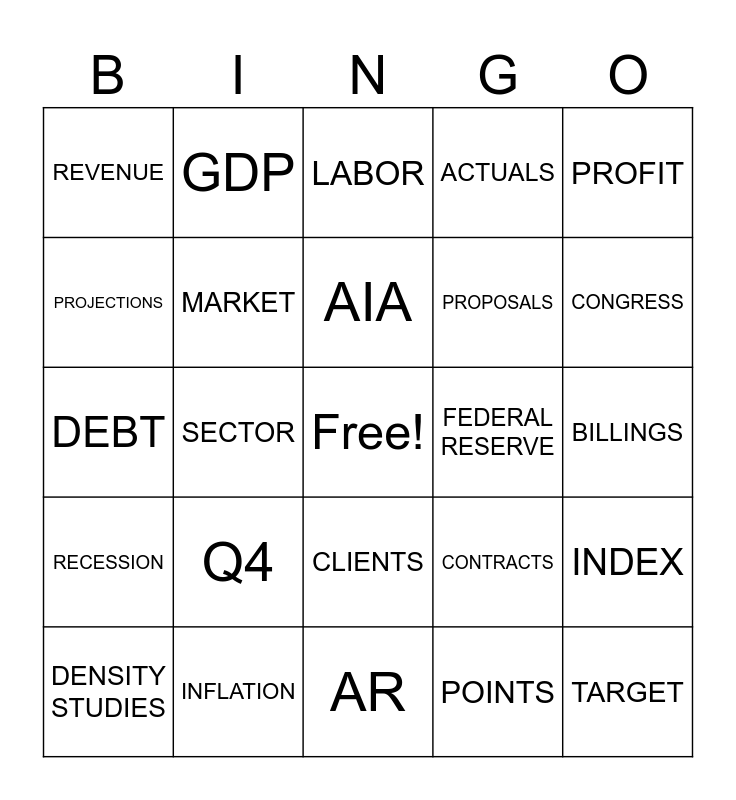 This bingo card has a free space and 24 words: Q4, INFLATION, AIA, DENSITY STUDIES, PROFIT, REVENUE, PROJECTIONS, GDP, FEDERAL RESERVE, CLIENTS, PROPOSALS, DEBT, CONTRACTS, INDEX, MARKET, POINTS, BILLINGS, LABOR, CONGRESS, SECTOR, TARGET, RECESSION, ACTUALS and AR.