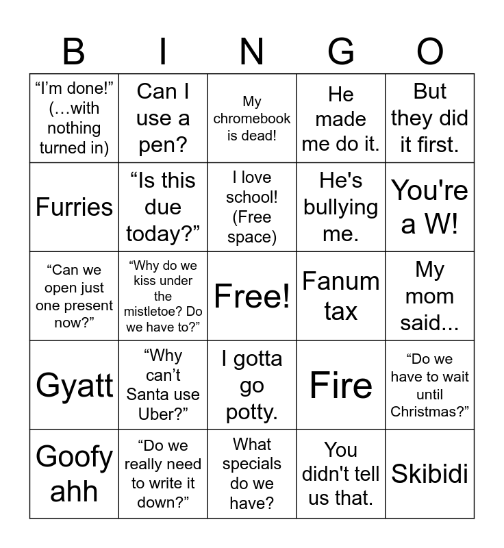 This bingo card has a free space and 80 words: 67!, Do we have to?, My chromebook is dead!, When is the Christmas party?, I didn't do it!, I am hungry., Guess what my elf did?, What time is lunch?, You didn't tell us that., Are we going outside for recess?, Can we play Prodigy?, Are you grading this?, I love school! (Free space), He made me do it., Can I have a snack?, Furries, Good Boy!, I gotta go potty., Can I go too?, My mom said..., I don't have a pencil., Can I use a pen?, What specials do we have?, He's bullying me., But they did it first., Bruh, Cap, No cap, Slay, Rizz, Gyatt, Ohio, It’s giving, Fanum tax, Skibidi, Goofy ahh, Sigma, NPC, Fire, You're a W!, “I wasn’t talking.”, “Do we have to?”, “But he started it!”, “Is this for a grade?”, “I wasn’t even doing anything.”, “I’m done!” (…with nothing turned in), “Do we really need to write it down?”, “Wait, what are we doing again?”, “Can I go to the bathroom?” (2 minutes after returning), “But I always sit by them!”, “This is boring.”, “Is this due today?”, “Can I have a snack?” (right after lunch), “I forgot my Chromebook.”, “I don’t get it.” (before reading the directions), “Are we doing anything fun today?”, “Can we watch a movie?”, “Does spelling count?”, “That’s not what my other teacher said.”, “Do we have to wait until Christmas?”, “Can we open just one present now?”, “Why do we have to eat vegetables? Santa doesn’t eat them.”, “I’m on the nice list… mostly.”, “I wrapped my own gift for Mom… it’s mostly tape.”, “Do reindeer get tired?”, “Why can’t we just have Christmas every day?”, “I’m going to ask for 100 presents this year.”, “Can I put cookies under the tree instead?”, “I made a snowman in the living room!”, “Santa has to eat all those cookies by himself? Poor guy.”, “Do elves get weekends off?”, “Why do we kiss under the mistletoe? Do we have to?”, “I don’t like fruitcake… or anything that’s healthy.”, “Can we make a gingerbread house and eat it immediately?”, “Do we have to wait for Christmas music?”, “I already know what’s in my stocking. I peeked.”, “Why can’t Santa use Uber?”, “I want to stay up all night… to see Santa… but also to play video games.”, Why isn't it a snow day? and Why didn't we get a late start?.
