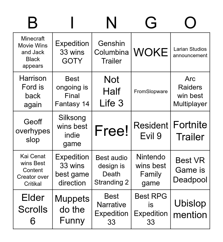 This bingo card has a free space and 24 words: Expedition 33 wins best game direction, Muppets do the Funny, Not Half Life 3, Elder Scrolls 6, Larian Studios announcement, Minecraft Movie Wins and Jack Black appears, Harrison Ford is back again, Expedition 33 wins GOTY, Resident Evil 9, Best audio design is Death Stranding 2, FromSlopware, Geoff overhypes slop, Nintendo wins best Family game, Best VR Game is Deadpool, Best ongoing is Final Fantasy 14, Best RPG is Expedition 33, Fortnite Trailer, Genshin Columbina Trailer, Arc Raiders win best Multiplayer, Silksong wins best indie game, Ubislop mention, Kai Cenat wins Best Content Creator over Critikal, WOKE and Best Narrative Expedition 33.