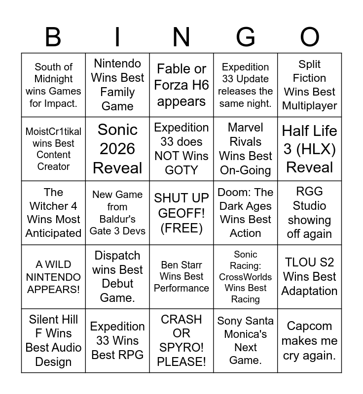 This bingo card has a free space and 24 words: Dispatch wins Best Debut Game., Expedition 33 Wins Best RPG, Expedition 33 does NOT Wins GOTY, Silent Hill F Wins Best Audio Design, Split Fiction Wins Best Multiplayer, South of Midnight wins Games for Impact., MoistCr1tikal wins Best Content Creator, Nintendo Wins Best Family Game, Doom: The Dark Ages Wins Best Action, Ben Starr Wins Best Performance, Marvel Rivals Wins Best On-Going, The Witcher 4 Wins Most Anticipated, Sonic Racing: CrossWorlds Wins Best Racing, TLOU S2 Wins Best Adaptation, Sonic 2026 Reveal, Sony Santa Monica's Next Game., RGG Studio showing off again, Fable or Forza H6 appears, Half Life 3 (HLX) Reveal, New Game from Baldur's Gate 3 Devs, Capcom makes me cry again., A WILD NINTENDO APPEARS!, Expedition 33 Update releases the same night. and CRASH OR SPYRO! PLEASE!.
