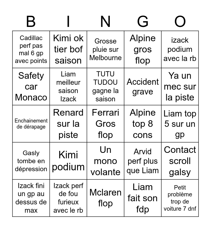 This bingo card has a free space and 24 words: Kimi podium, Izack perf de fou furieux avec le rb, TUTU TUDOU gagne la saison, Izack fini un gp au dessus de max, izack podium avec la rb, Cadillac perf pas mal 6 gp avec points, Safety car Monaco, Kimi ok tier bof saison, Alpine top 8 cons, Un mono volante, Accident grave, Enchainement de dérapage, Arvid perf plus que Liam, Contact scroll galsy, Liam meilleur saison Izack, Liam fait son fdp, Liam top 5 sur un gp, Grosse pluie sur Melbourne, Ya un mec sur la piste, Renard sur la piste, Petit problème trop de voiture 7 dnf, Gasly tombe en dépression, Alpine gros flop and Mclaren flop.