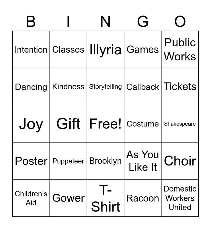 This bingo card has a free space and 87 words: Arden, Tempest, Brooklyn, Ancestors, Odyssey, Hercules, Music, Community, Picnic, Potluck, Nametag, Sticker, Choir, Shakespeare, Acting, Storytelling, Performance, Queens, Bronx, Manhattan, Reflection, Remembrance, Joy, Delacorte, Racoon, Newsletter, Improv, Play, Scene, Journey, Gower, Hero, Artist, Puppeteer, Dancing, Water bottle, Tickets, Ambassador, Hospitality, Gift, Intergenerational, Veteran, Singing, Costume, Tent, Public Works, Pablo, Classes, Winter’s Tale, Twelfth Night, Seed Project, Greenwood Tree, Poster, Food, Calendar, Audition, Callback, Sharing, Survey, Games, Kindness, Generosity, Support, Art Making, Brownsville Recreation Center, Casita Maria, Center for Family Life, Children’s Aid, Domestic Workers United, DreamYard, The Fortune Society, Military Resilience Foundation, Illyria, As You Like It, Island, Harmony, Whoosh-Woah, T-Shirt, Pericles, Anniversary, Attendance, MetroCard, Golf Cart, Circle, Warm Up, Intention and Energy.