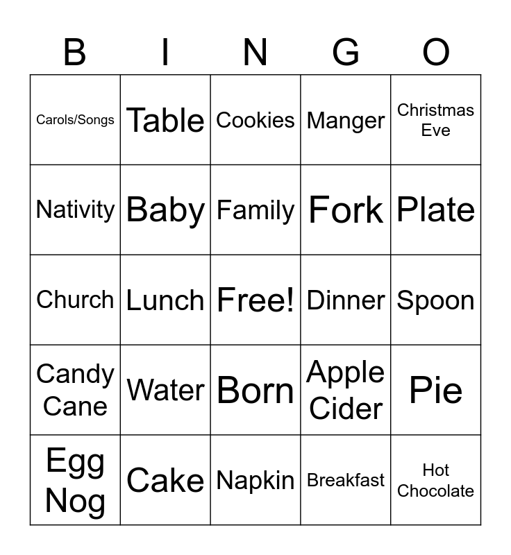 This bingo card has a free space and 35 words: Merry Christmas, Christmas Tree, Jesus, Baby, Born, Manger, Nativity, Present/Gift, Family, Friends, Church, Christmas Eve, New Year's Day, New Year's Eve, Carols/Songs, Dinner, Breakfast, Lunch, Candy Cane, Hot Chocolate, Apple Cider, Egg Nog, Pie, Cake, Cookies, Plate, Bowl, Cup, Fork, Spoon, Knife, Napkin, Water, Table and Chair.