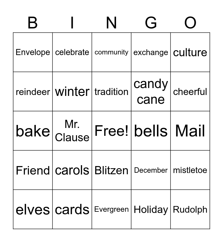 This bingo card has a free space and 34 words: Different, Holiday, visit, family, Friend, winter, culture, elves, celebrate, decorate, tradition, community, together, ribbon, bells, cheerful, cards, bake, carols, December, Blitzen, Evening, Envelope, Mail, Evergreen, Rudolph, exchange, earmuffs, candy cane, reindeer, memories, Mr. Clause, mistletoe and toys.