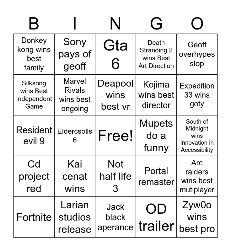 This bingo card has a free space and 24 words: Fortnite, Kai cenat wins, Deapool wins best vr, OD trailer, Geoff overhypes slop, Donkey kong wins best family, Sony pays of geoff, Gta 6, Mupets do a funny, South of Midnight wins Innovation in Accessibility, Resident evil 9, Marvel Rivals wins best ongoing, Portal remaster, Arc raiders wins best mutiplayer, Silksong wins Best Independent Game, Larian studios release, Jack black aperance, Death Stranding 2 wins Best Art Direction, Expedition 33 wins goty, Cd project red, Eldercsolls 6, Not half life 3, Kojima wins best director and Zyw0o wins best pro.