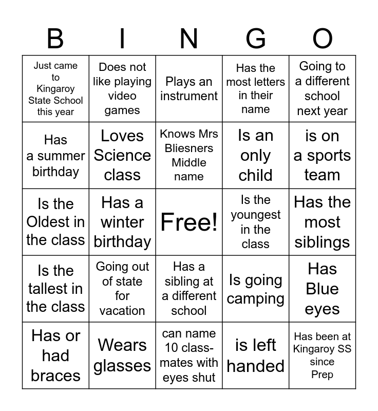 This bingo card has a free space and 24 words: Going out of state for vacation, Wears glasses, Knows Mrs Bliesners Middle name, Has or had braces, Going to a different school next year, Just came to Kingaroy State School this year, Has a summer birthday, Does not like playing video games, Is the youngest in the class, Has a sibling at a different school, Is an only child, Is the Oldest in the class, Is going camping, Has Blue eyes, Loves Science class, is left handed, Has the most siblings, Plays an instrument, is on a sports team, Has a winter birthday, Has been at Kingaroy SS since Prep, Is the tallest in the class, Has the most letters in their name and can name 10 class- mates with eyes shut.
