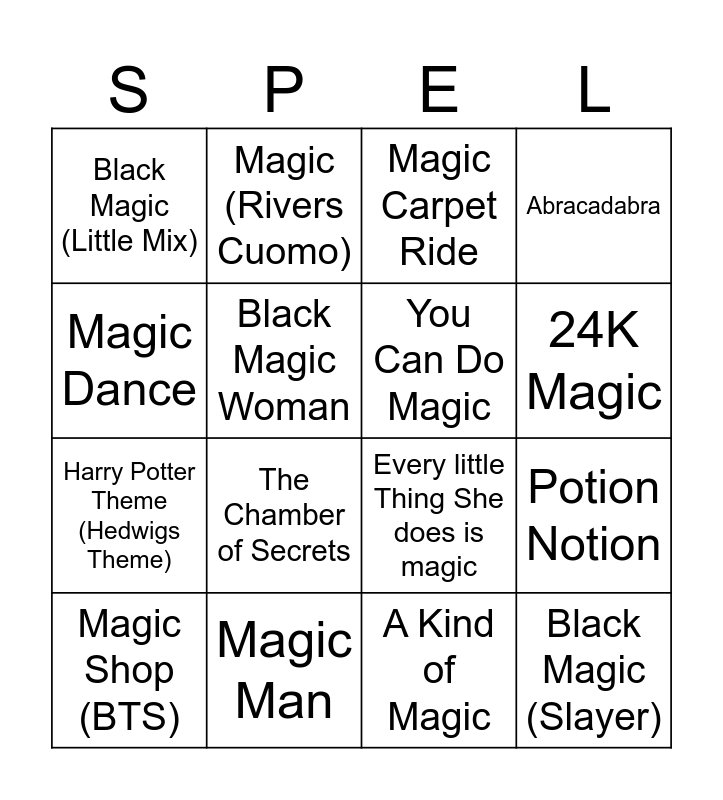This bingo card has 23 words: Black Magic (Slayer), This Magic Moment, 24K Magic, Potion (Dua Lipa/Young Thug), Magic Dance, Black Magic (Little Mix), Black Magic Woman, Magic (Rivers Cuomo), Magic Shop (BTS), Christmas at Hogwarts, The Chamber of Secrets, Harry Potter Theme (Hedwigs Theme), Magic (The Cars), magic (Pilot), Magic Man, Do You Believe in Magic, Magic Carpet Ride, Every little Thing She does is magic, You Can Do Magic, Potion Notion, Abracadabra, A Kind of Magic and Strange Magic.