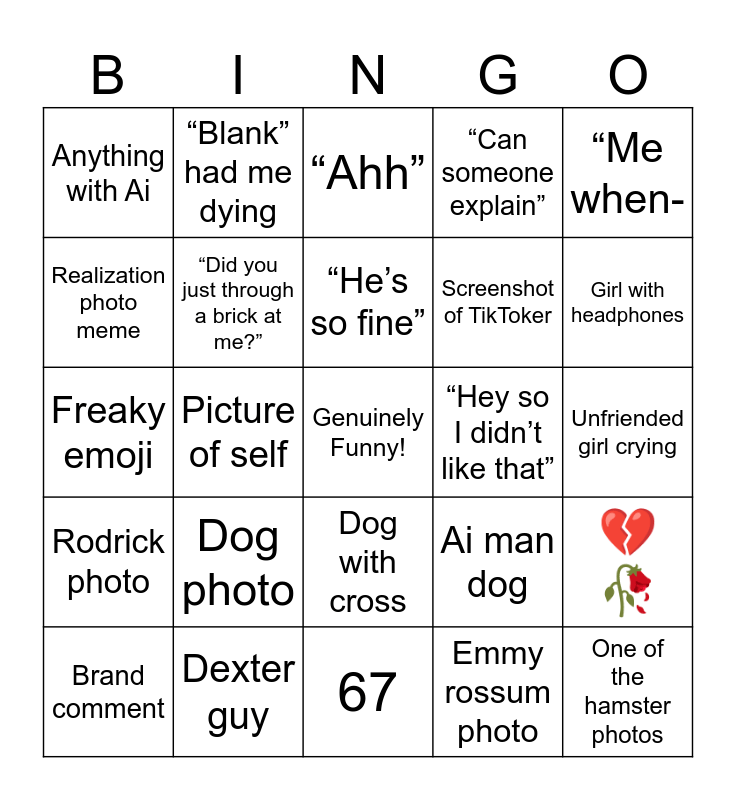 This bingo card has a free space and 24 words: Dog photo, Dexter guy, “He’s so fine”, Brand comment, “Me when-, Anything with Ai, Realization photo meme, “Blank” had me dying, “Hey so I didn’t like that”, Dog with cross, Screenshot of TikToker, Freaky emoji, Ai man dog, 💔🥀, “Did you just through a brick at me?”, Emmy rossum photo, Unfriended girl crying, “Ahh”, Girl with headphones, Picture of self, One of the hamster photos, Rodrick photo, “Can someone explain” and 67.