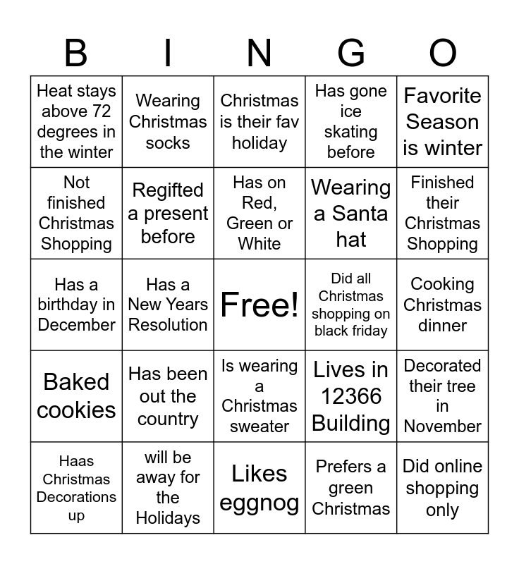 This bingo card has a free space and 24 words: Has been out the country, will be away for the Holidays, Has on Red, Green or White, Haas Christmas Decorations up, Favorite Season is winter, Heat stays above 72 degrees in the winter, Not finished Christmas Shopping, Wearing Christmas socks, Did all Christmas shopping on black friday, Is wearing a Christmas sweater, Wearing a Santa hat, Has a birthday in December, Lives in 12366 Building, Decorated their tree in November, Regifted a present before, Prefers a green Christmas, Cooking Christmas dinner, Christmas is their fav holiday, Finished their Christmas Shopping, Has a New Years Resolution, Did online shopping only, Baked cookies, Has gone ice skating before and Likes eggnog.