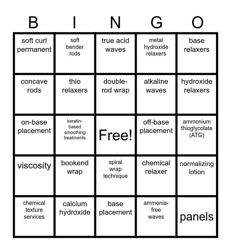 This bingo card has a free space and 24 words: bookend wrap, calcium hydroxide, double-rod wrap, chemical texture services, base relaxers, soft curl permanent, concave rods, soft bender rods, off-base placement, spiral wrap technique, alkaline waves, on-base placement, chemical relaxer, normalizing lotion, thio relaxers, ammonia-free waves, ammonium thioglycolate (ATG), true acid waves, hydroxide relaxers, keratin-based smoothing treatments, panels, viscosity, metal hydroxide relaxers and base placement.