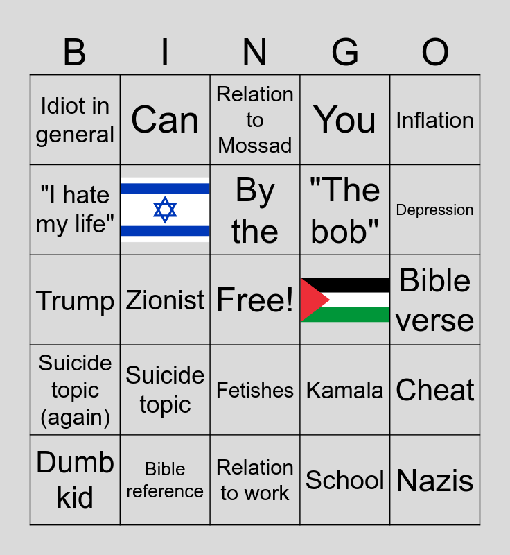 This bingo card has 2 images, a free space and 27 words: Dumb kid, Far-right, Zionist, Pro-Pali, Idiot in general, Relation to Mossad, Suicide topic, Bible reference, Bible verse, Nazis, Relation to work, School, Depression, "Sybau", Fetishes, Suicide topic (again), Inflation, Trump, Kamala, Anime, "The bob", "I hate my life", You, Can, Cheat, By the and Way.