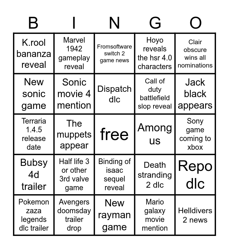 This bingo card has a free space and 24 words: Half life 3 or other 3rd valve game, Avengers doomsday trailer drop, Dispatch dlc, Pokemon zaza legends dlc trailer, Clair obscure wins all nominations, K.rool bananza reveal, New sonic game, Marvel 1942 gameplay reveal, Among us, Binding of isaac sequel reveal, Call of duty battlefield slop reveal, Terraria 1.4.5 release date, Death stranding 2 dlc, Repo dlc, Sonic movie 4 mention, Mario galaxy movie mention, Sony game coming to xbox, Fromsoftware switch 2 game news, Jack black appears, The muppets appear, Helldivers 2 news, Bubsy 4d trailer, Hoyo reveals the hsr 4.0 characters and New rayman game.