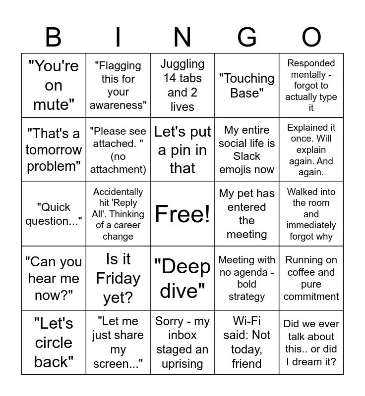 This bingo card has a free space and 29 words: "Can everyone see my screen?", "Let me just share my screen...", Juggling 14 tabs and 2 lives, Camera off because it's one of those days, Responded mentally - forgot to actually type it, "You're on mute", "Please see attached. "(no attachment), Let's put a pin in that, My pet has entered the meeting, Running on coffee and pure commitment, "Let's circle back", Accidentally hit 'Reply All'. Thinking of a career change, Wi-Fi said: Not today, friend, Did we ever talk about this.. or did I dream it?, "Quick question...", Final_final_ v3_REAL_ final.docz, Sorry - my inbox staged an uprising, Meeting with no agenda - bold strategy, Explained it once. Will explain again. And again., "Can you hear me now?", Is it Friday yet?, Wow.. the office is packed today. I counted 4 people, My entire social life is Slack emojis now, Walked into the room and immediately forgot why, "That's a tomorrow problem", "Flagging this for your awareness", "Deep dive", "Touching Base" and "Low hanging fruit".