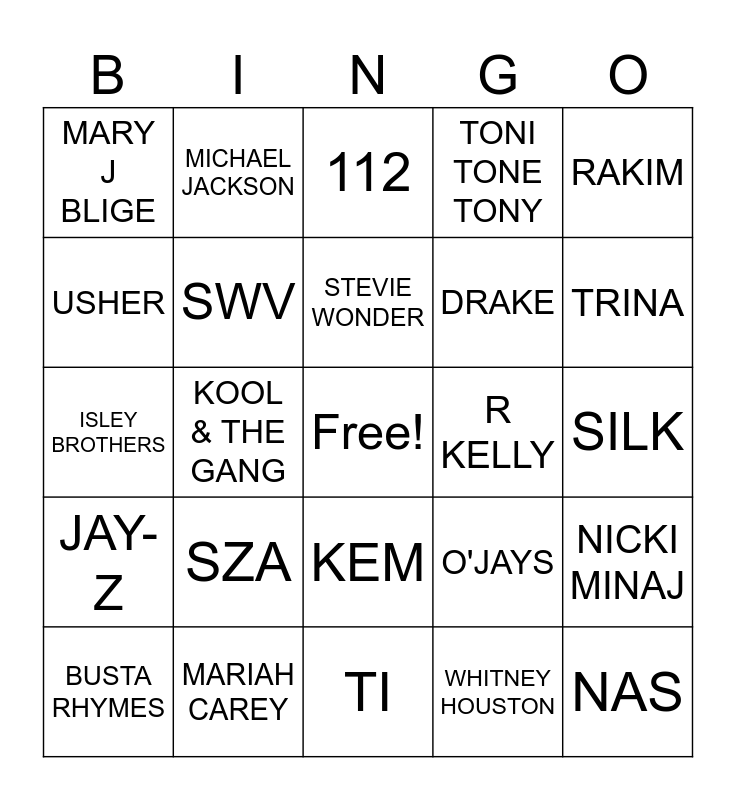This bingo card has a free space and 24 words: SZA, MARIAH CAREY, STEVIE WONDER, BUSTA RHYMES, RAKIM, MARY J BLIGE, USHER, MICHAEL JACKSON, R KELLY, KEM, DRAKE, ISLEY BROTHERS, O'JAYS, NICKI MINAJ, SWV, WHITNEY HOUSTON, SILK, 112, TRINA, KOOL & THE GANG, NAS, JAY-Z, TONI TONE TONY and TI.