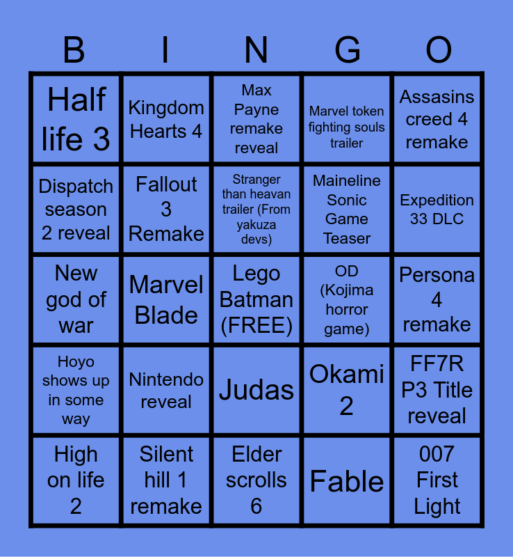 This bingo card has a free space and 24 words: Nintendo reveal, Silent hill 1 remake, Stranger than heavan trailer (From yakuza devs), High on life 2, Assasins creed 4 remake, Half life 3, Dispatch season 2 reveal, Kingdom Hearts 4, OD (Kojima horror game), Judas, Maineline Sonic Game Teaser, New god of war, Okami 2, FF7R P3 Title reveal, Fallout 3 Remake, Fable, Persona 4 remake, Max Payne remake reveal, Expedition 33 DLC, Marvel Blade, 007 First Light, Hoyo shows up in some way, Marvel token fighting souls trailer and Elder scrolls 6.