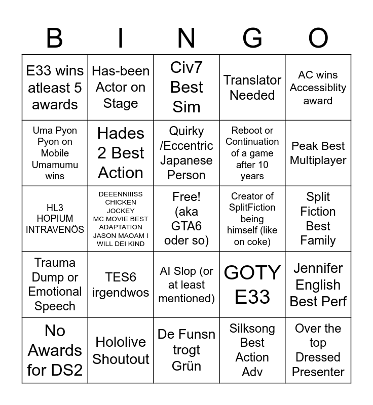 This bingo card has a free space and 24 words: TES6 irgendwos, Hololive Shoutout, Quirky /Eccentric Japanese Person, No Awards for DS2, AC wins Accessiblity award, E33 wins atleast 5 awards, Uma Pyon Pyon on Mobile Umamumu wins, Has-been Actor on Stage, Creator of SplitFiction being himself (like on coke), AI Slop (or at least mentioned), Reboot or Continuation of a game after 10 years, HL3 HOPIUM INTRAVENÖS, GOTY E33, Jennifer English Best Perf, Hades 2 Best Action, Silksong Best Action Adv, Split Fiction Best Family, Civ7 Best Sim, Peak Best Multiplayer, DEEENNIIISS CHICKEN JOCKEY MC MOVIE BEST ADAPTATION JASON MAOAM I WILL DEI KIND, Over the top Dressed Presenter, Trauma Dump or Emotional Speech, Translator Needed and De Funsn trogt Grün.