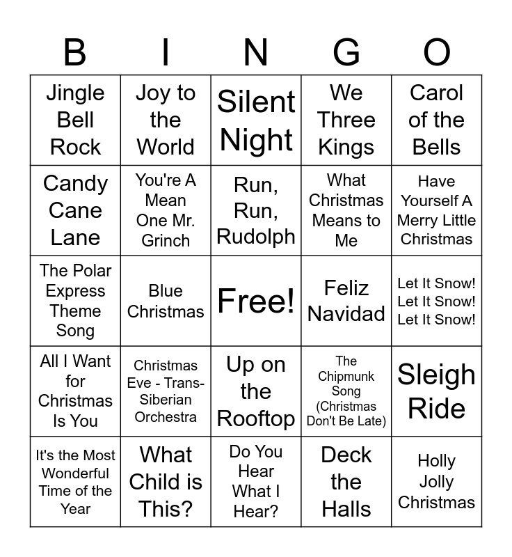 This bingo card has a free space and 35 words: Grandma Got Run Over By A Reindeer, Jingle Bells, Mary, Did You Know, You're A Mean One Mr. Grinch, Up on the Rooftop, We Three Kings, Candy Cane Lane, O Come Let Us Adore Him, Run, Run, Rudolph, Frosty the Snowman, The Polar Express Theme Song, Carol of the Bells, Santa Claus is Coming to Town, Rockin' Around the Christmas Tree, Jingle Bell Rock, Feliz Navidad, Deck the Halls, Blue Christmas, All I Want for Christmas Is You, Holly Jolly Christmas, The Chipmunk Song (Christmas Don't Be Late), It's the Most Wonderful Time of the Year, Sleigh Ride, What Child is This?, Silent Night, Have Yourself A Merry Little Christmas, It's Beginning to Look a Lot Like Christmas, Little Saint Nick, What Christmas Means to Me, Let It Snow! Let It Snow! Let It Snow!, Rudolph the Red-Nosed Reindeer, Do You Hear What I Hear?, Christmas Eve - Trans-Siberian Orchestra, Joy to the World and Little Drummer Boy.