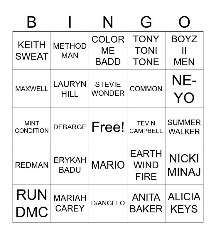 This bingo card has a free space and 24 words: ERYKAH BADU, MARIAH CAREY, STEVIE WONDER, RUN DMC, BOYZ II MEN, KEITH SWEAT, MAXWELL, METHOD MAN, TEVIN CAMPBELL, MARIO, COMMON, MINT CONDITION, EARTH WIND FIRE, NICKI MINAJ, LAURYN HILL, ANITA BAKER, SUMMER WALKER, COLOR ME BADD, NE-YO, DEBARGE, ALICIA KEYS, REDMAN, TONY TONI TONE and D/ANGELO.