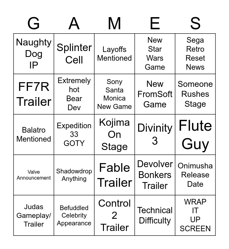 This bingo card has a free space and 24 words: Shadowdrop Anything, Befuddled Celebrity Appearance, Sony Santa Monica New Game, Judas Gameplay/ Trailer, Sega Retro Reset News, Naughty Dog IP, FF7R Trailer, Splinter Cell, Divinity 3, Fable Trailer, New FromSoft Game, Balatro Mentioned, Devolver Bonkers Trailer, Onimusha Release Date, Extremely hot Bear Dev, Technical Difficulty, Flute Guy, Layoffs Mentioned, Someone Rushes Stage, Expedition 33 GOTY, WRAP IT UP SCREEN, Valve Announcement, New Star Wars Game and Control 2 Trailer.