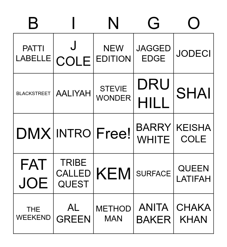This bingo card has a free space and 24 words: TRIBE CALLED QUEST, AL GREEN, STEVIE WONDER, THE WEEKEND, JODECI, PATTI LABELLE, BLACKSTREET, J COLE, BARRY WHITE, KEM, DRU HILL, DMX, SURFACE, QUEEN LATIFAH, AALIYAH, ANITA BAKER, KEISHA COLE, NEW EDITION, SHAI, INTRO, CHAKA KHAN, FAT JOE, JAGGED EDGE and METHOD MAN.