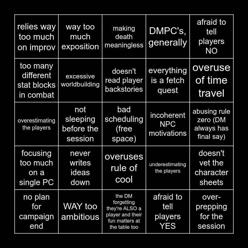 This bingo card has a free space and 24 words: never writes ideas down, WAY too ambitious, doesn't read player backstories, no plan for campaign end, afraid to tell players NO, relies way too much on improv, too many different stat blocks in combat, way too much exposition, incoherent NPC motivations, overuses rule of cool, everything is a fetch quest, overestimating the players, underestimating the players, doesn't vet the character sheets, excessive worldbuilding, afraid to tell players YES, abusing rule zero (DM always has final say), making death meaningless, overuse of time travel, not sleeping before the session, over-prepping for the session, focusing too much on a single PC, DMPC's, generally and the DM forgetting they're ALSO a player and their fun matters at the table too.